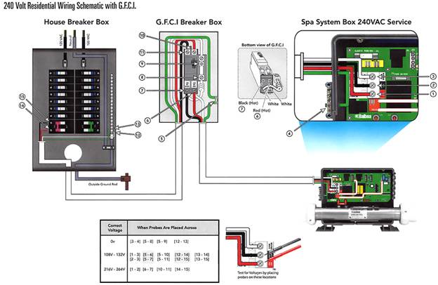 As shown above, run conduit and wiring from the main electrical breaker to a GFCI Breaker Box that is set up a minimum of 5 feet from the hot tub (a GFCI breaker box is not included with the AV-2). Connect only to a circuit protected by a Class A Ground Fault Circuit Interrupter (GFCI) or Residual Current Device (RCD) mounted at least 5’ (1.52M) from the water line of the spa/hot tub and in line of sight from the equipment compartment. Run conduit and wiring from the breaker box into the Balboa Control System on the hot tub side.