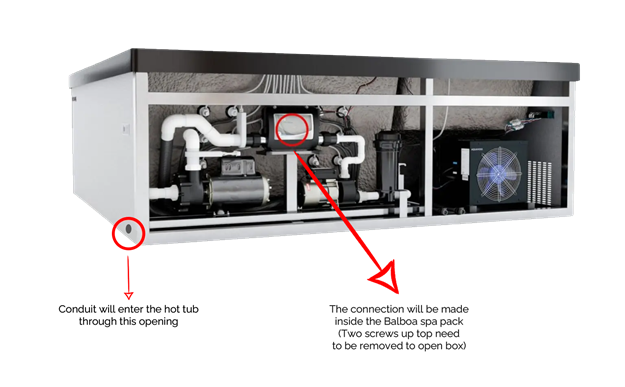 Refer to image below to understand the location of the Balboa Control System and the conduit point of entry: